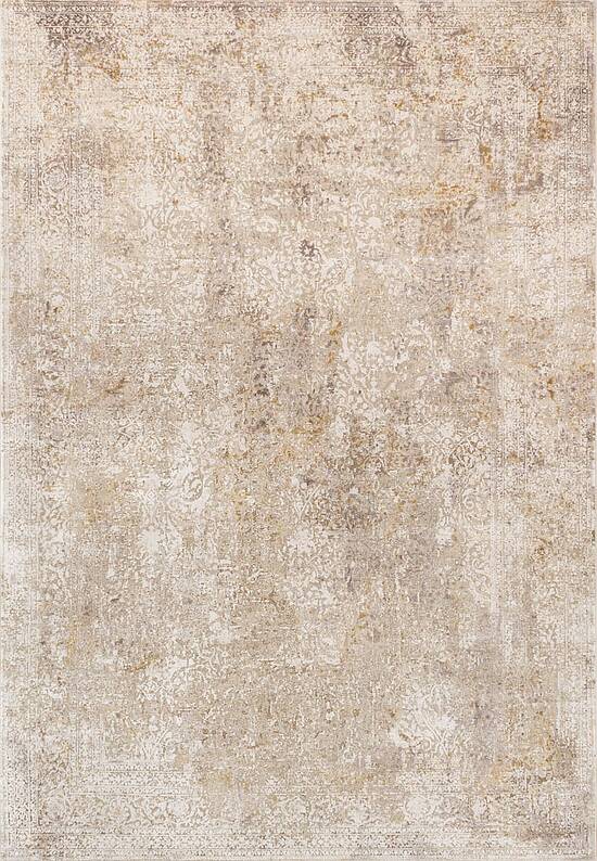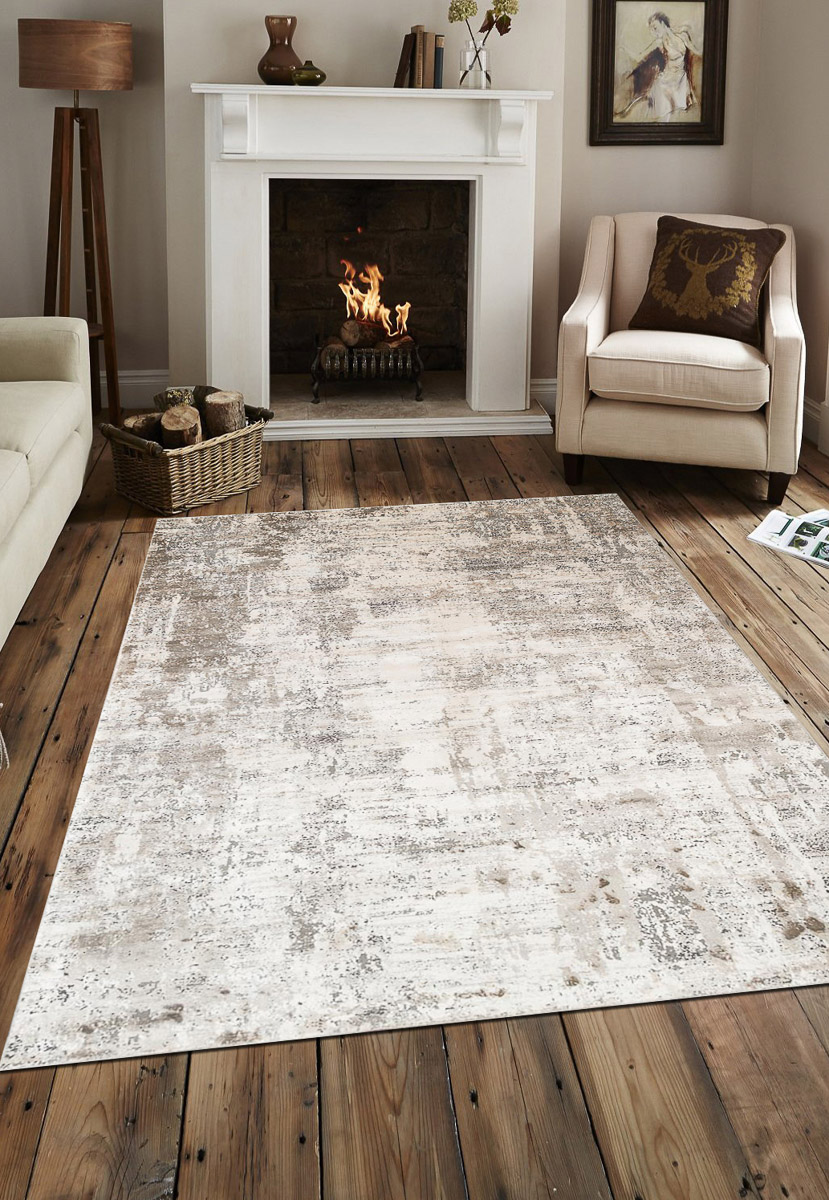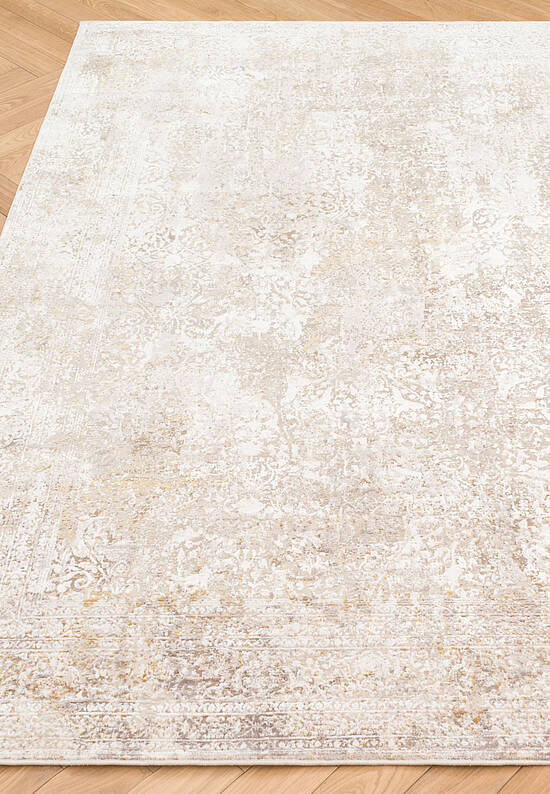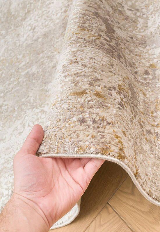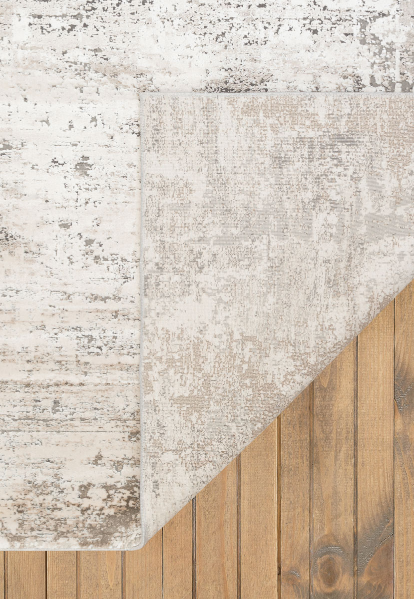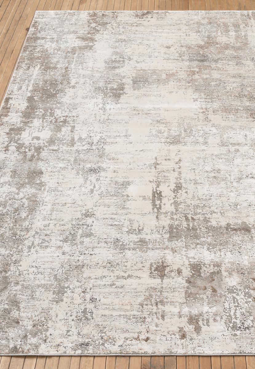 Турецкий ковёр машинной работы. Выполнен в серо-бежевых цветах с однотонной абстракцией. Сочетание вискозы и акрила придаёт ворсу шелковистость и блеск. В наличии размер 140x200 см.