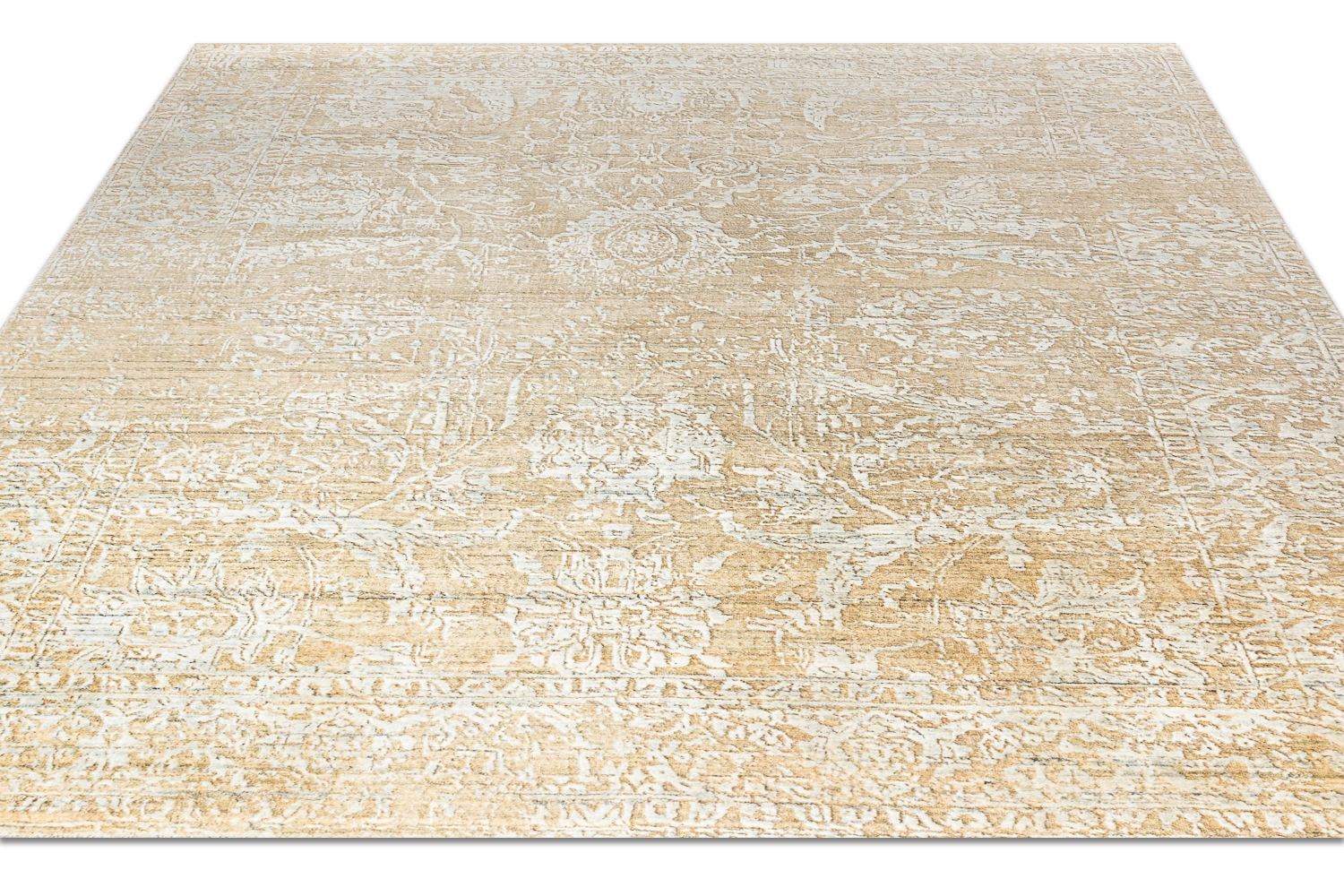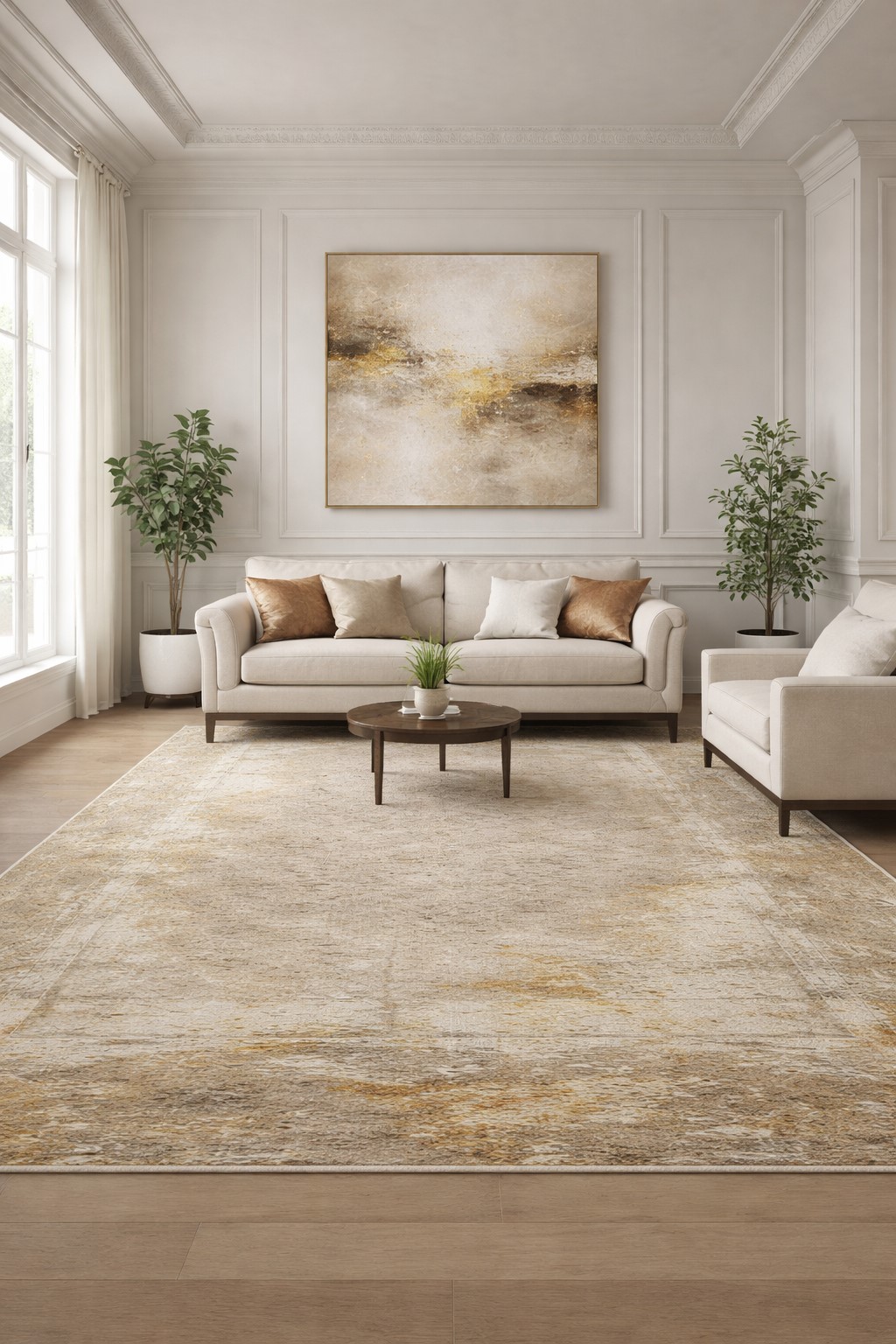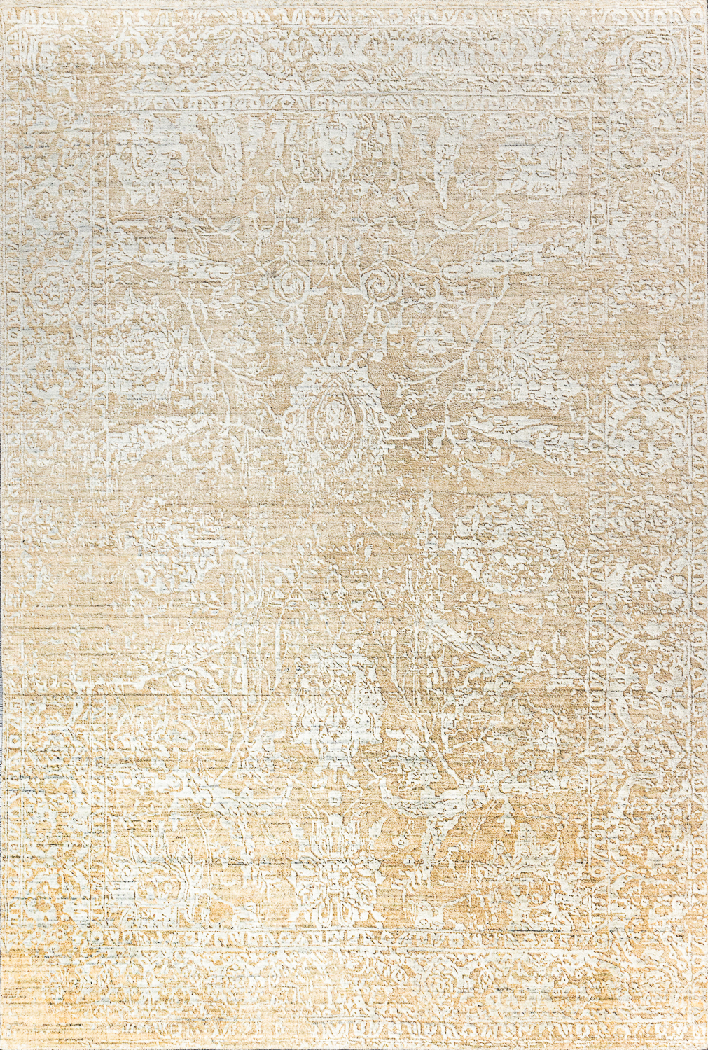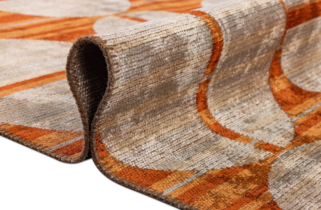 Турецкий ковер выполнен с использованием эвкалиптового шёлка и акриловых нитей, что обеспечивает изящный блеск поверхности, мягкость и при этом высокую прочность. Он привлекателен своим абстрактным узором и универсальной бежево-золотистой палитрой, которые легко вписываются в современные интерьеры. Плотное машинное плетение с высоким числом узлов (2 000 000 узлов/м2) делает изделие устойчивым к износу, деформации и механическим воздействиям, а мягкий рельефный ворс (высотой 5 мм) приятен на ощупь и добавляет уюта. Размер 240*290см